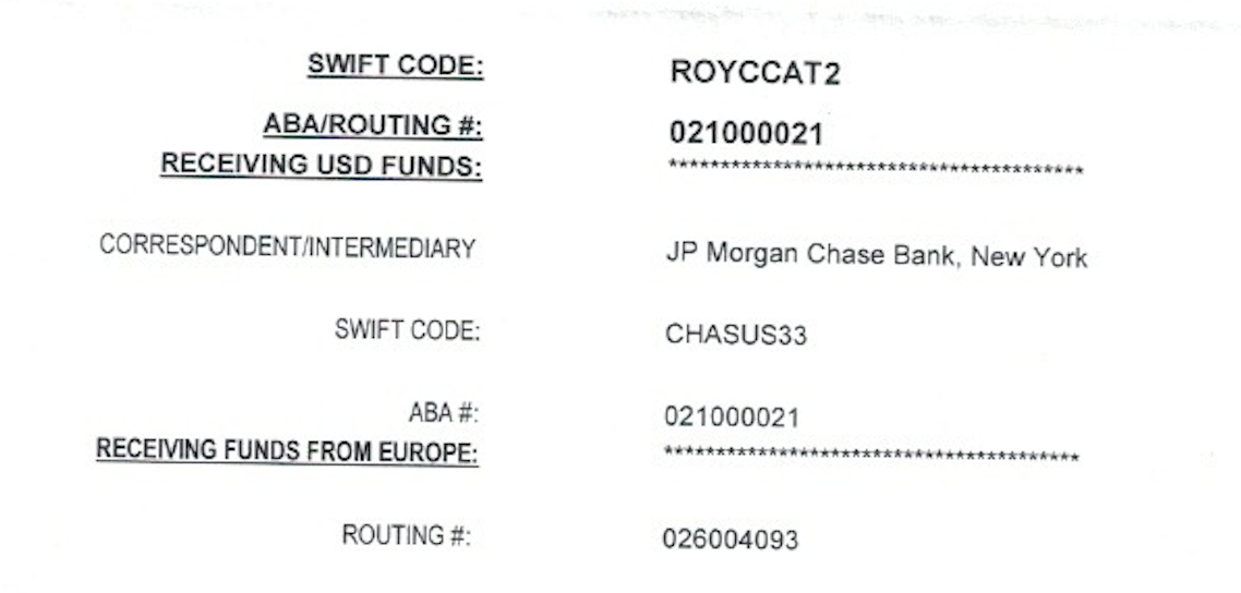 RBC Royal Bank’s SWIFT BIC (if funds coming from another International location): ROYCCAT2